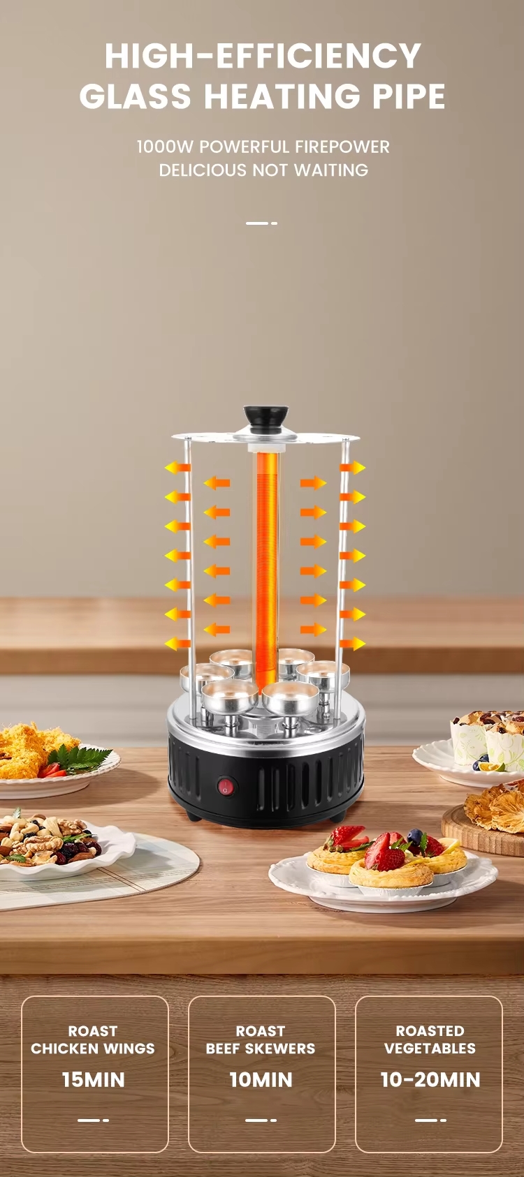 La rotation automatisée garantit une cuisson complète et bien dorée pour chaque brochette.