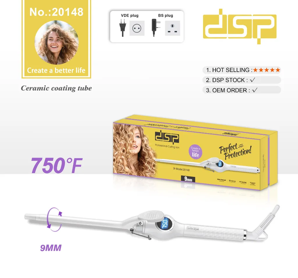 Créez facilement des boucles fines, dynamiques et longue tenue avec le Fer à Boucler DSP 9 mm – 30W avec afficheur digital. Cet appareil de coiffure est conçu pour offrir une précision professionnelle et un contrôle optimal de la température, afin de réaliser des coiffures impeccables directement à la maison.